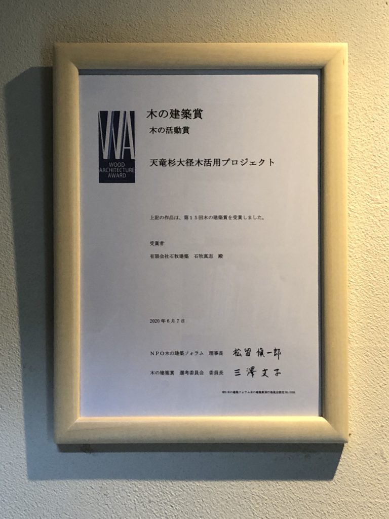 今年、「天竜材大径木活用プロジェクト」で頂いた 木の建築賞(木の活動賞)の賞状が届きました。 6月に予定されていた東京大学での授賞式は残念ながらコロナで1年延期 …