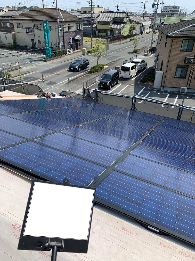 今日は、北区の現場で太陽発電の設置が行われました。 弊社で設置する太陽光はタニタハウジングウエア社の『はたらく屋根 エコテクノルーフ』です。屋根が太陽光パネルと …