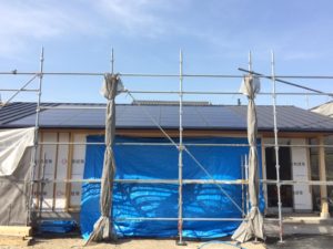浜松市浜北区I様邸 石牧建築では、足場解体前に煙を使って通気が確保されているかを確認する事もします。 社長と私と大工さん・板金屋さんも仕事し …