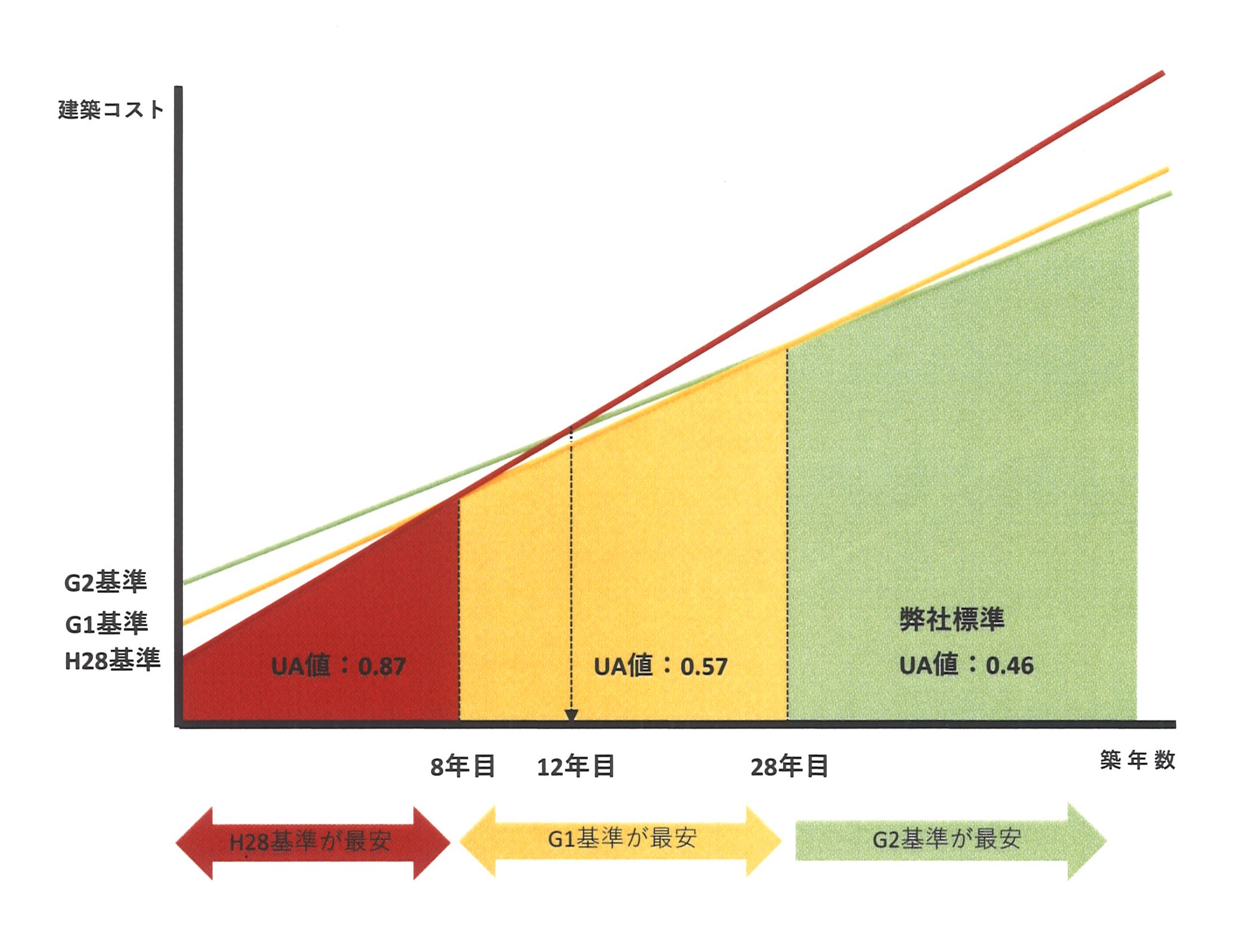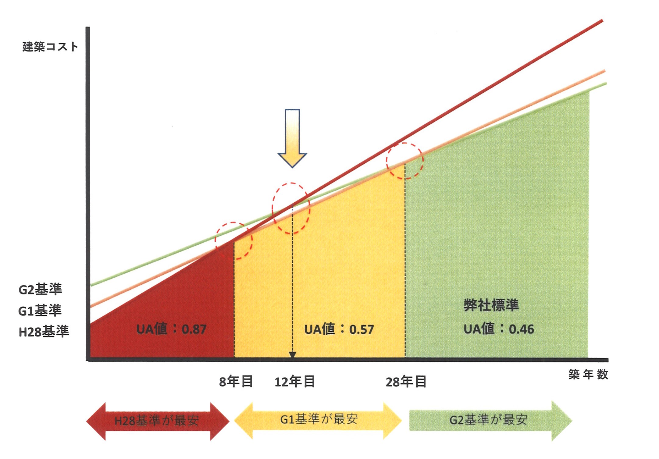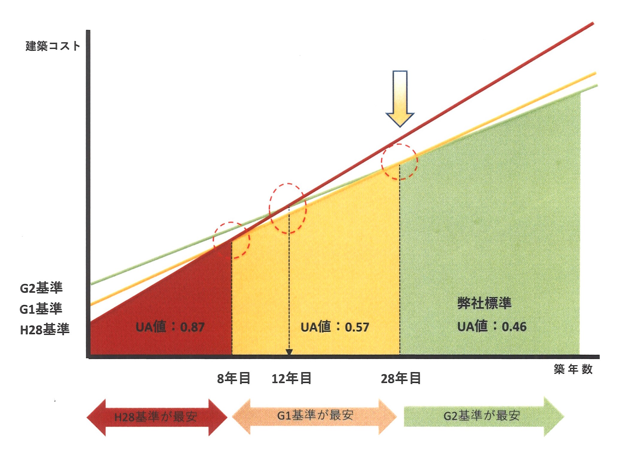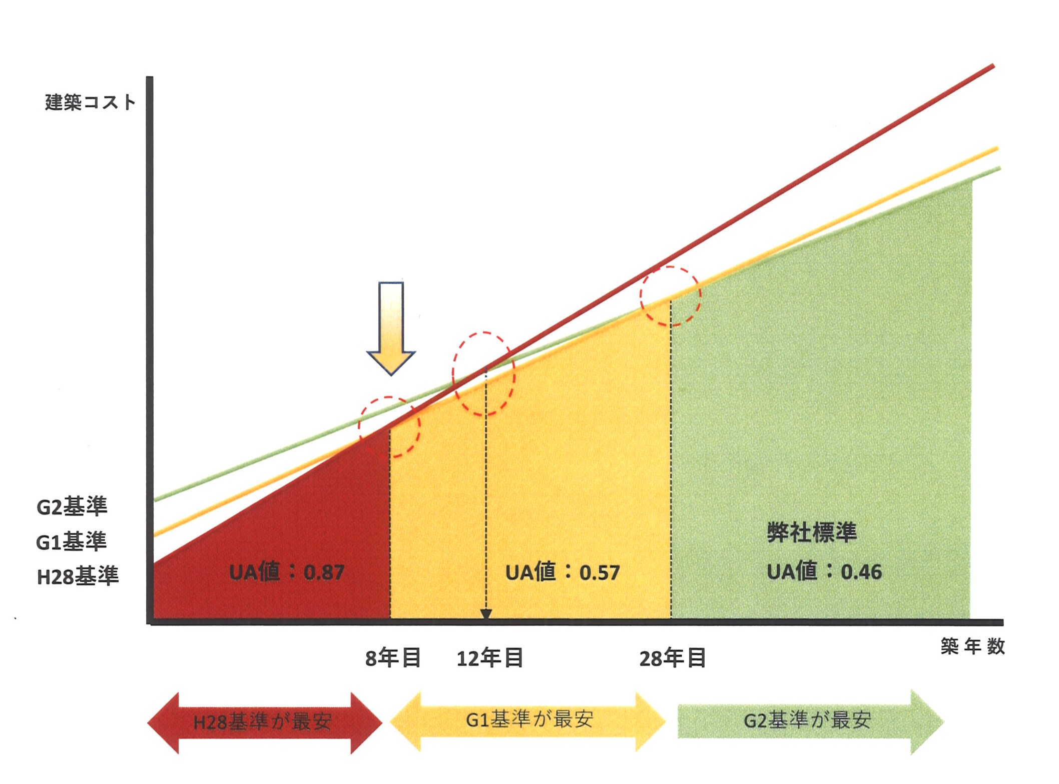 ここまでしか住まない住宅であれば、H28年基準のトータルコストが最安値という事になります。