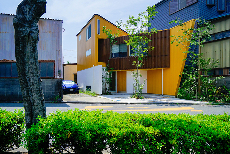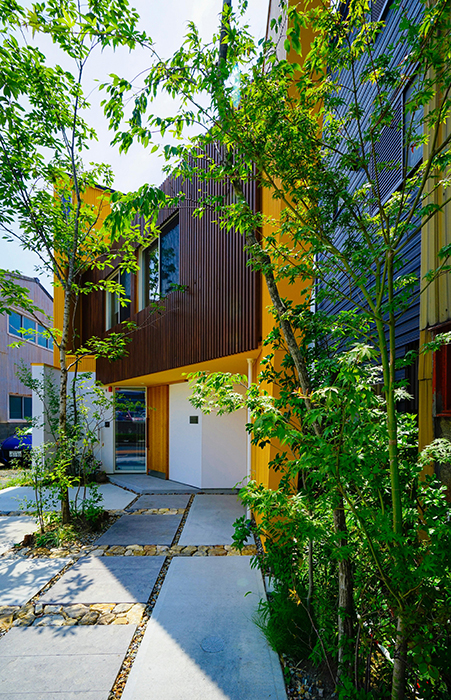 こうして、街中の狭小地に静かに主張する建築が出来上がった。個性的なイエローカラーの金属板に白漆喰壁を組み合わせた外観。ダークブラウンの木格子がアクセントとして入り込む。木造建築を手掛けていることをイメージさせる配色と植栽。環境に配慮していることを裏付けるそよ風を導入したギャラリー(G)&オフィス(O)は、ひとつの建築の中に7つの空間が入り組む。匠の技を見せる建築は、まちなかのオアシスとありうるであろう。(文:村松篤設計事務所 村松篤氏)
