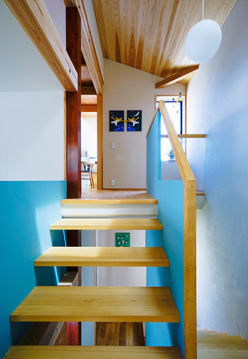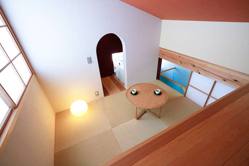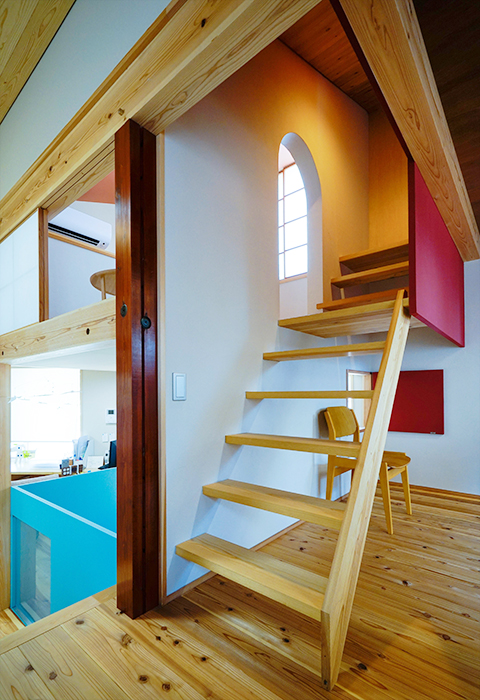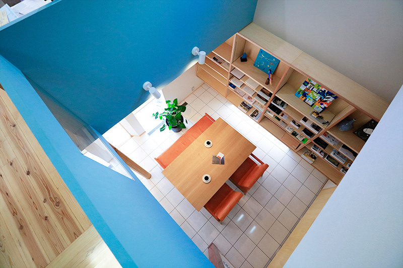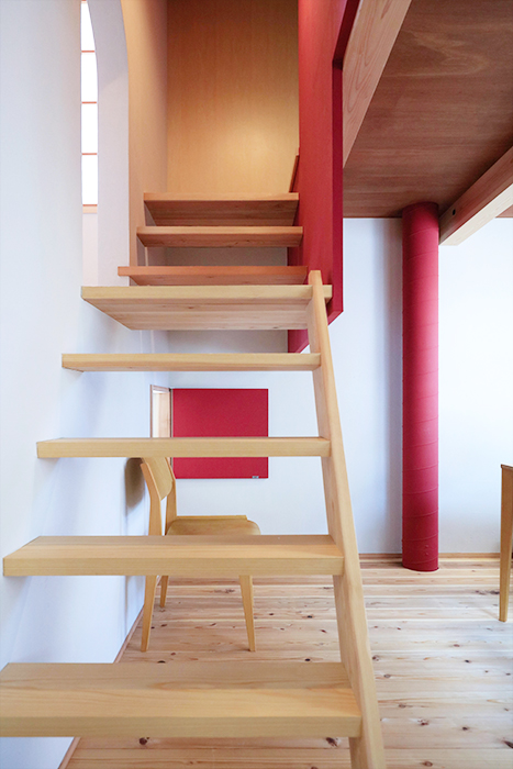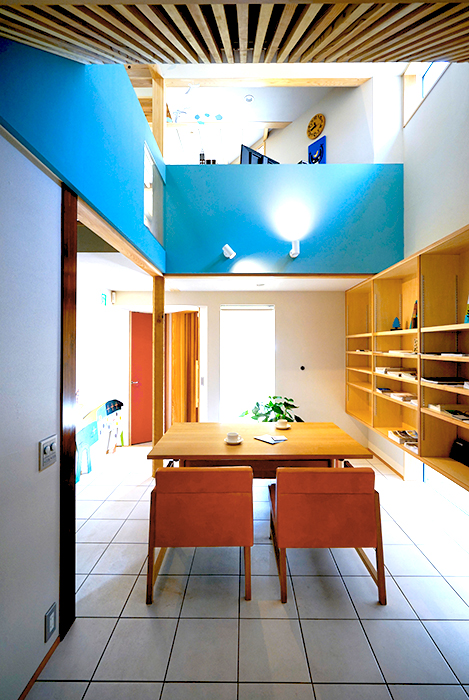 駐車スペースの間をすり抜けるようなアプローチの先にエントランスがある。ドアを開けると、複雑な空間の連続だ。手前には吹抜空間、通路の先には階段があり左手にはまた別の空間、奥には坪庭が見える。階段を折り返すとオーヴァーハングした空間があり、吹抜けの横を上がるともうひとつの空間が現れる。その脇の階段を上がる途中と上がった先に、それぞれ別の空間が用意され、まるで忍者屋敷のような構成だ。階段もひとつの空間として利用できるようにと考えた。