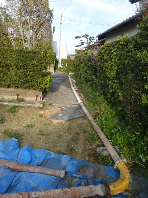 路地裏を抜けて 掲載:2019年04月17日 先日始まりました新築物件。 敷地北側の土留めの工事が進んでいるなか、 コンクリート打設。 お隣さんと共有の進入路を通り・・・ 曲がって・・・ やってます。 大都会では、 狭小地で常日頃やられている同業の方達は多いかと思いますが、 弊社の施工範囲ではなかなか珍しい光景。 近隣の方達にも協力をいただきながら工事は続きます。 佐原