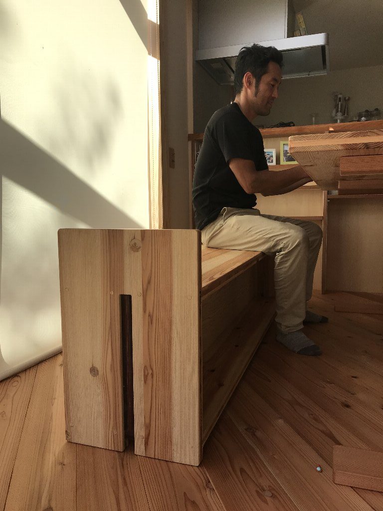 わざわ座のテーブルに合わせてデザインし、杉のパネルを使い、アクセントに少し漆を塗っています。