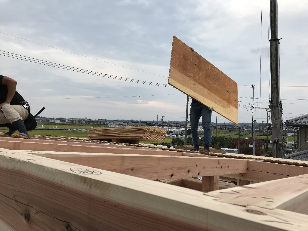 毎回思うのですが、厚み24㎜の合板を持って梁の上をひょいひょいと歩く大工たちはすごいなー。