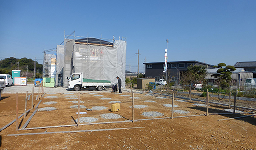 建築予定地の地盤について、地盤調査会社が調査します。 地盤に不安のある場所では土地改良工事を行います。