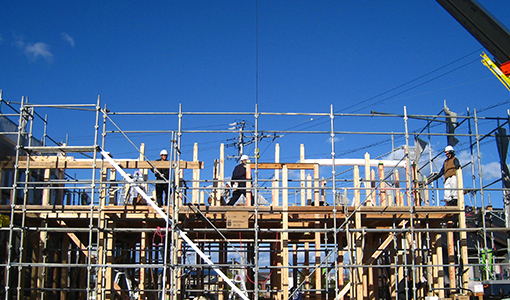 棟梁を中心に構造材を組んでいきます。 また、新しい家への祝福とともに、職人たちへの労いと今後の工事の無事を祈って上棟式を行います。