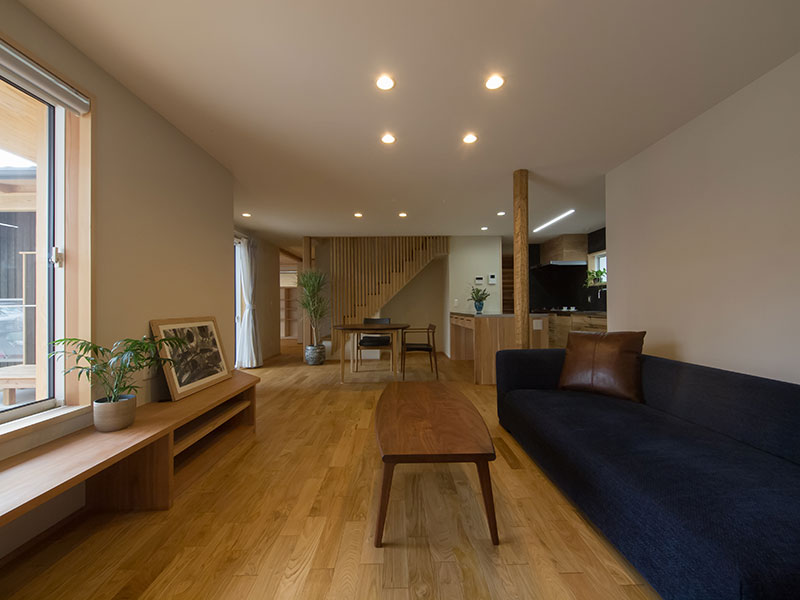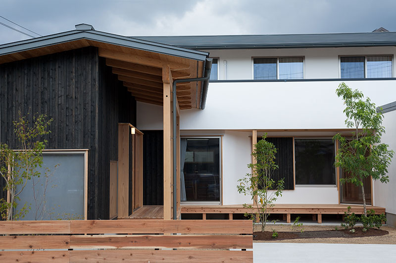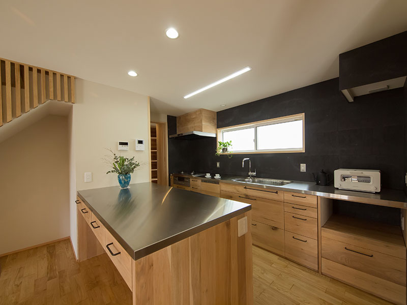 宮脇のいえ [工法規模] 木造2階建て [敷地面積] 370.75㎡ [延床面積] 160.65㎡ 設計:しましま設計室 Photo:大関正行氏 ------- 「お城が好きなんだよね」とポツリつぶやかれたご主人。それなら外観は武家屋敷のような黒と白のコントラストをつけたデザインにしよう!奥さまはパンやお菓子を作るのも好きとのことでしたので、広い作業台を配したキッチンにしよう!ご夫婦とたくさんお話をさせていただき、それぞれが楽しめるスペースを持つ家になりました。