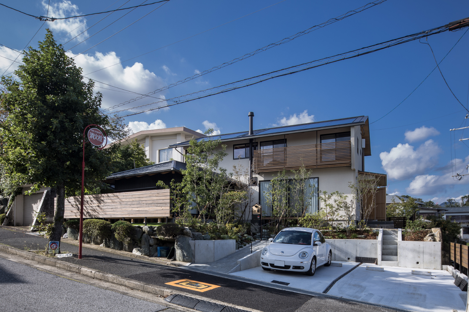 前面道路から1~2mほどの高低差があり、法面上に植栽を施しまわりからの視線をやわらかく隔てています。