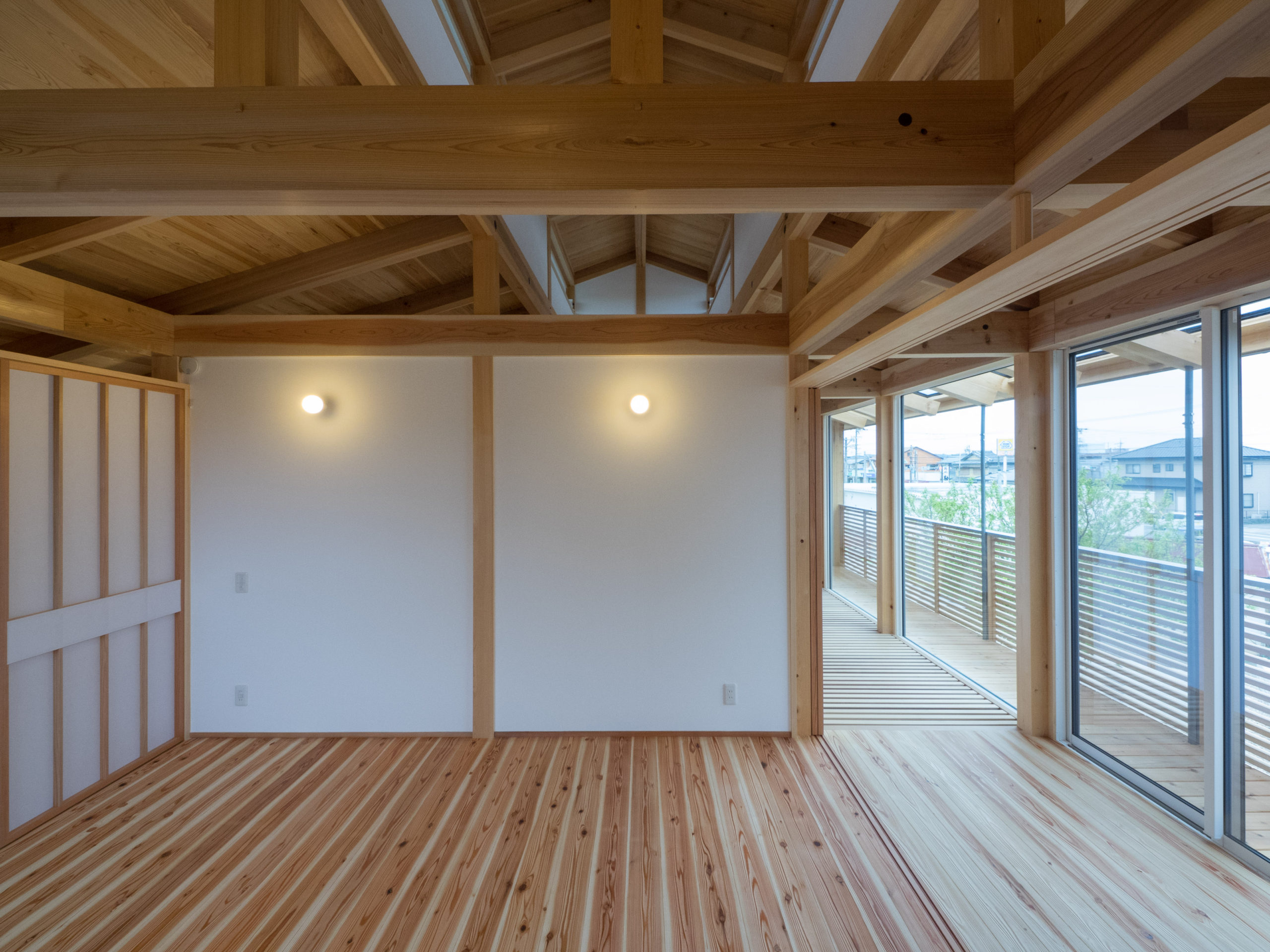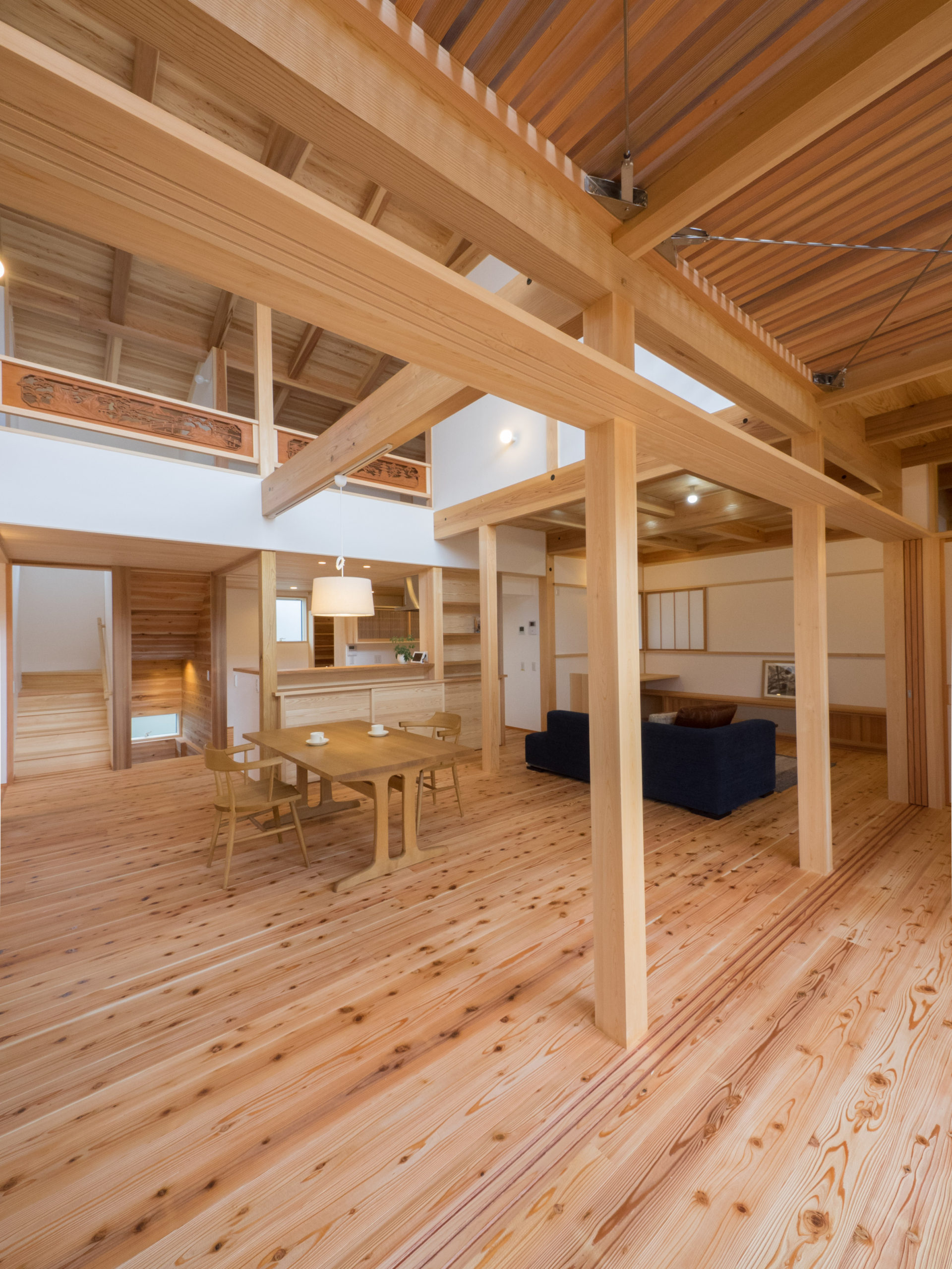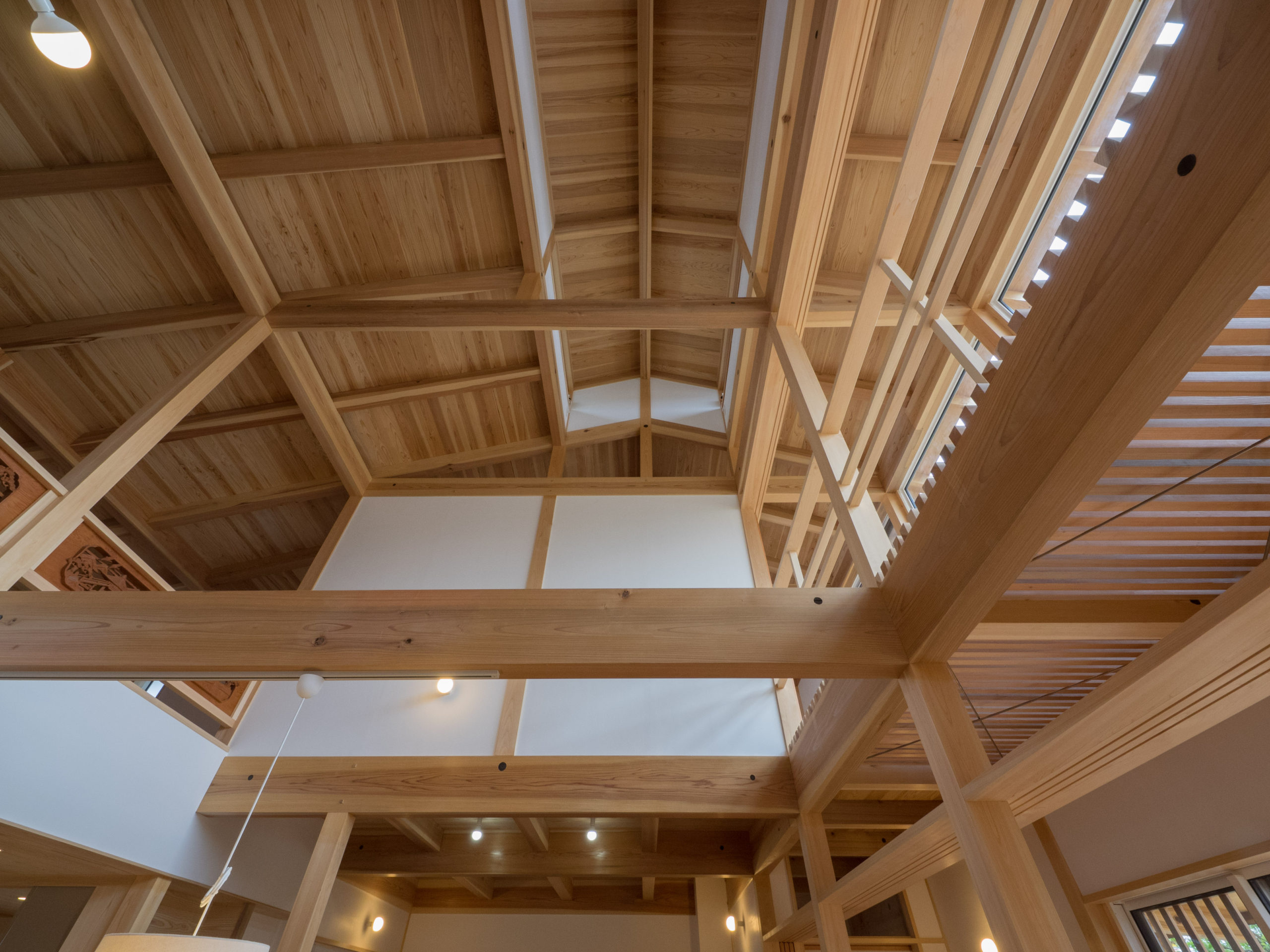 柱は製材所((株)フジイチ)と協同で開発した背割れのない桧の芯去り材を使用。