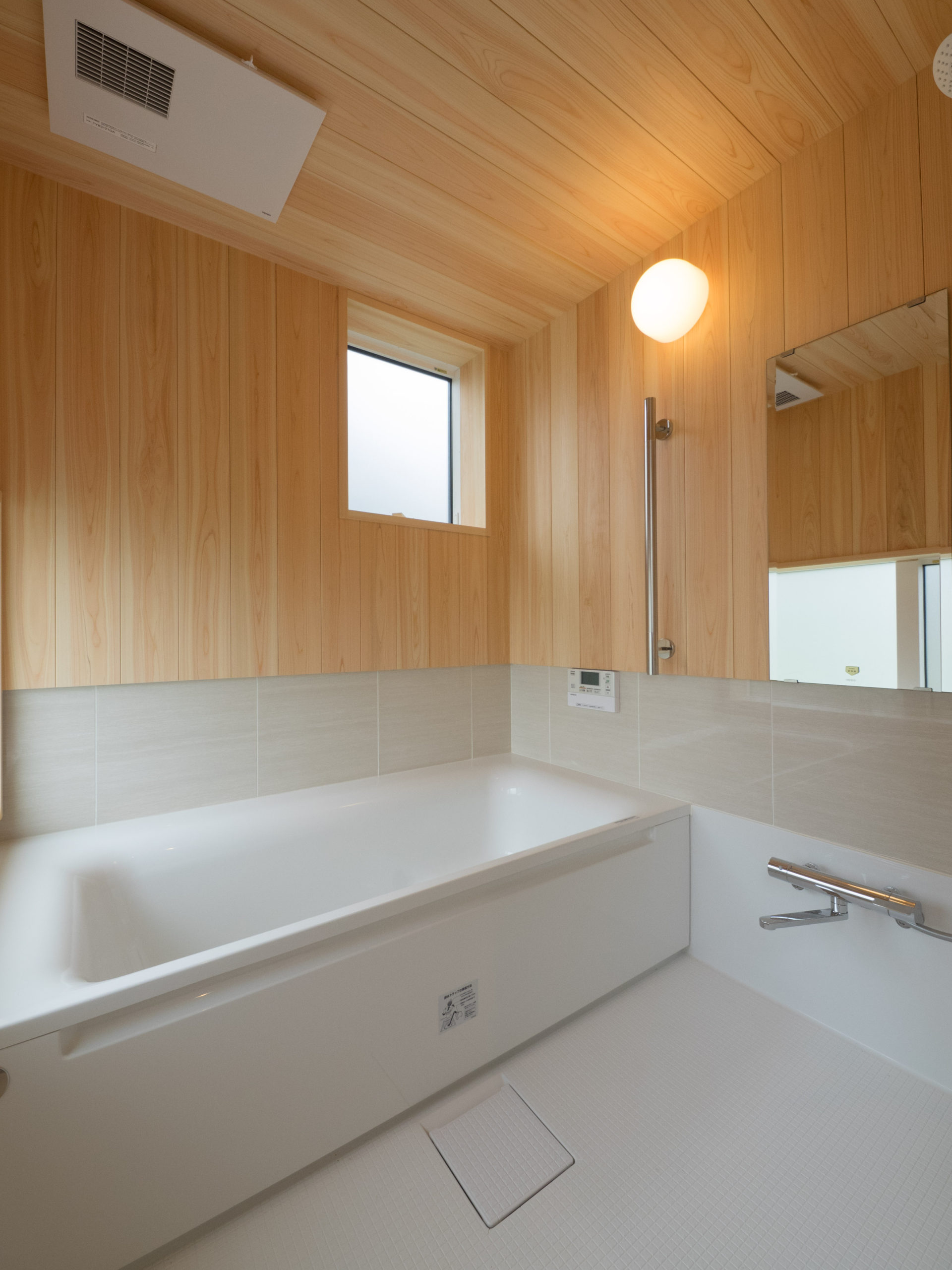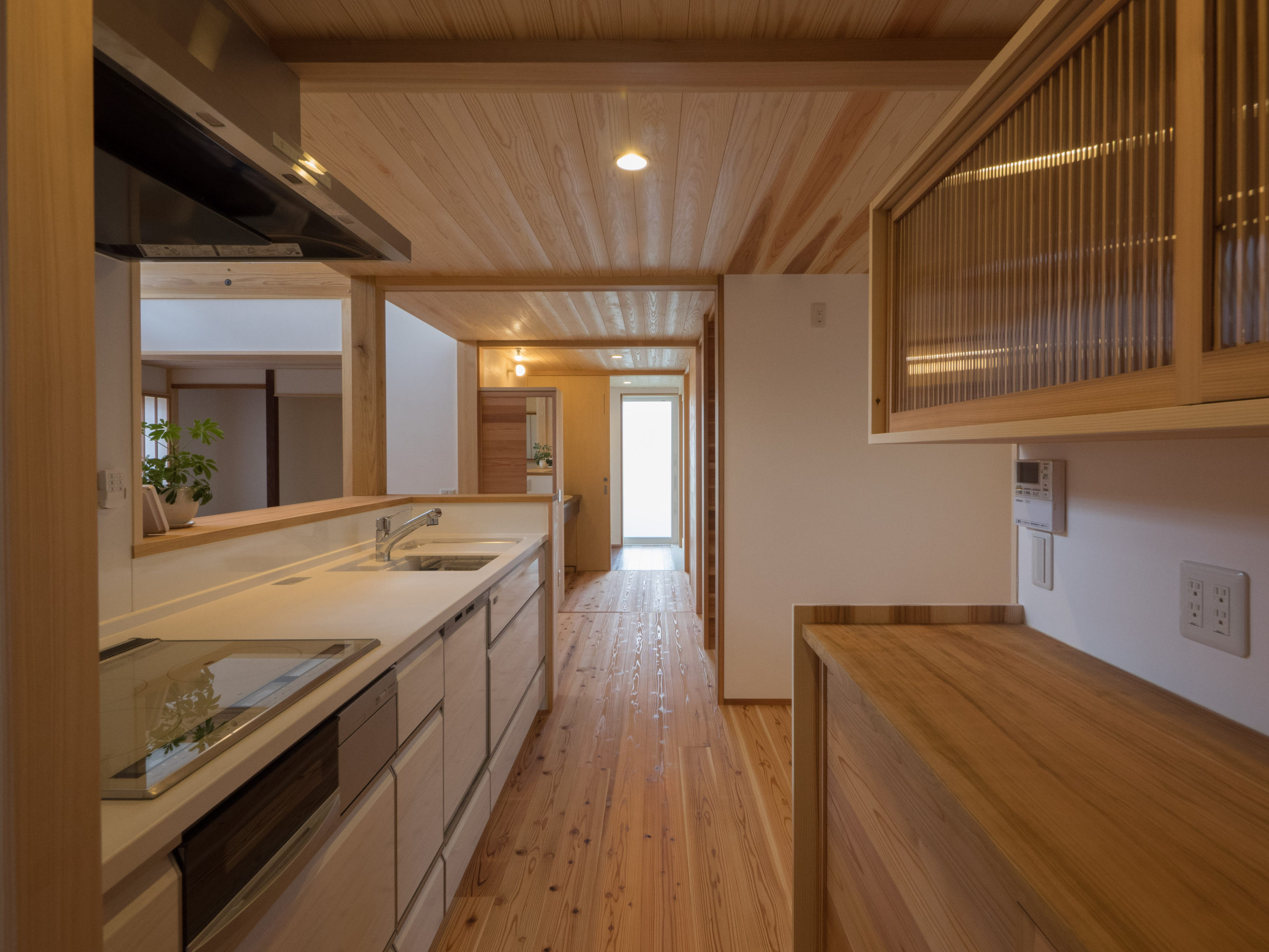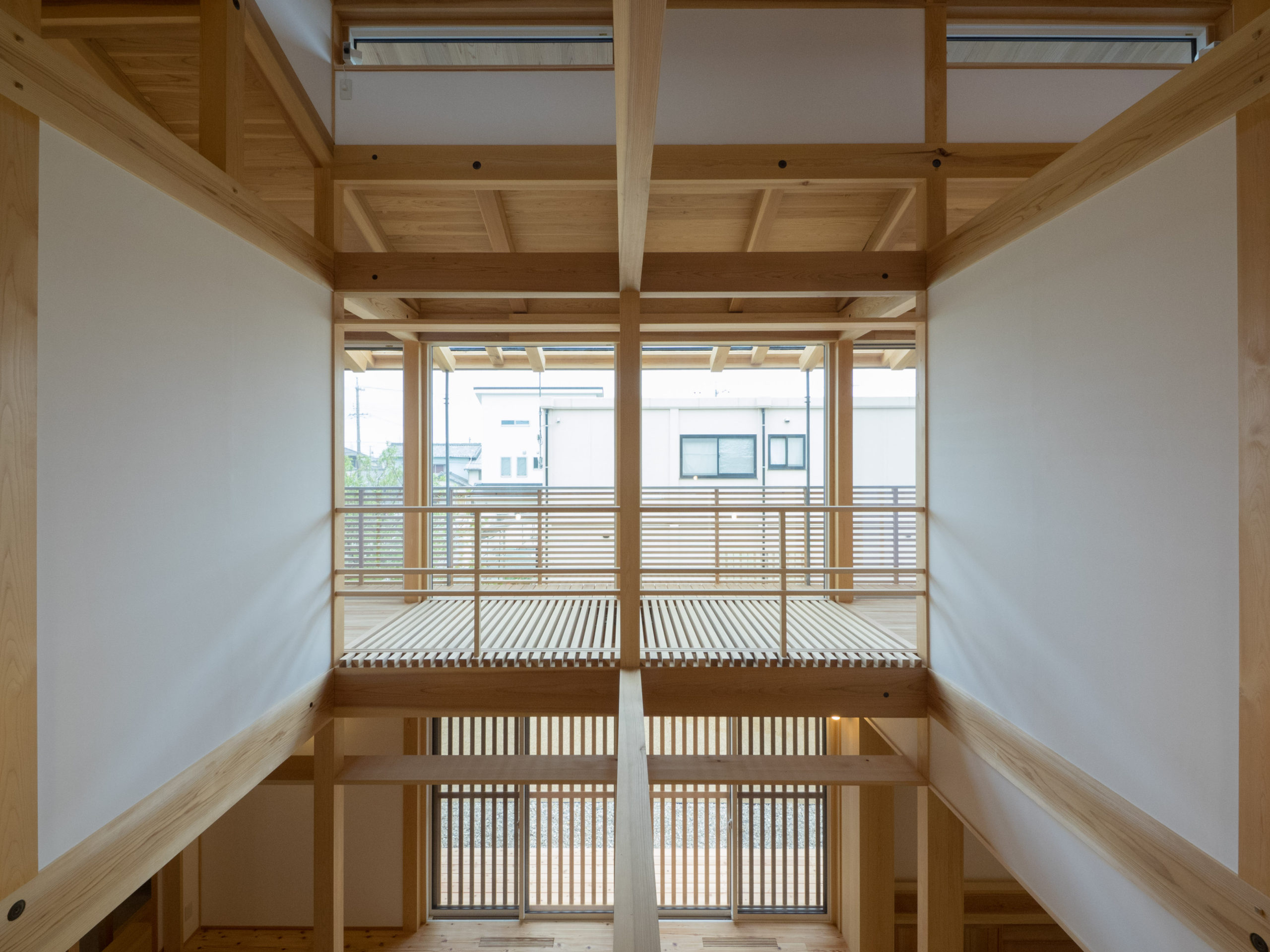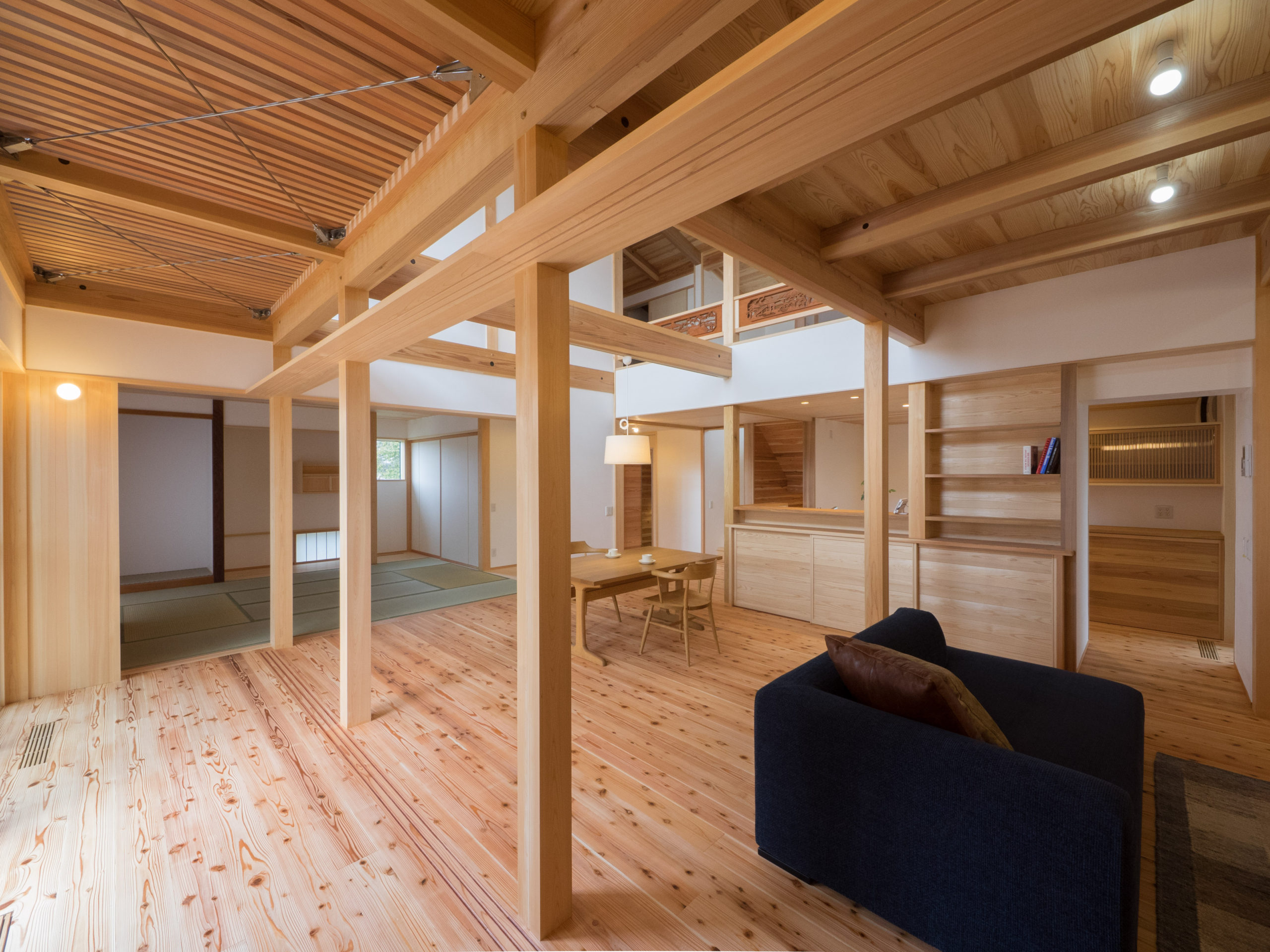 柱は製材所((株)フジイチ)と協同で開発した背割れのない桧の芯去り材を使用。