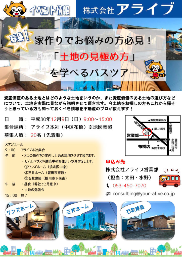 株式会社アライブ主催「家づくりでお悩みの方必見!『土地の見極め方』を学べるバスツアー」が開催されます。 ツアーでは翌週完成見学会を行う石牧建 ...
